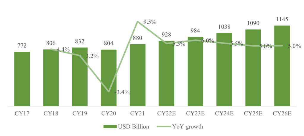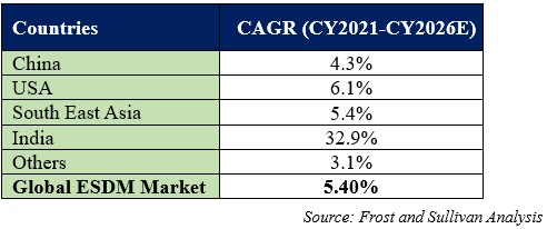 The global ESDM industry is expected to grow at a CAGR of 5.4% from CY21 to CY26E as opposed to 3.4% CAGR recorded from CY17 to CY21.