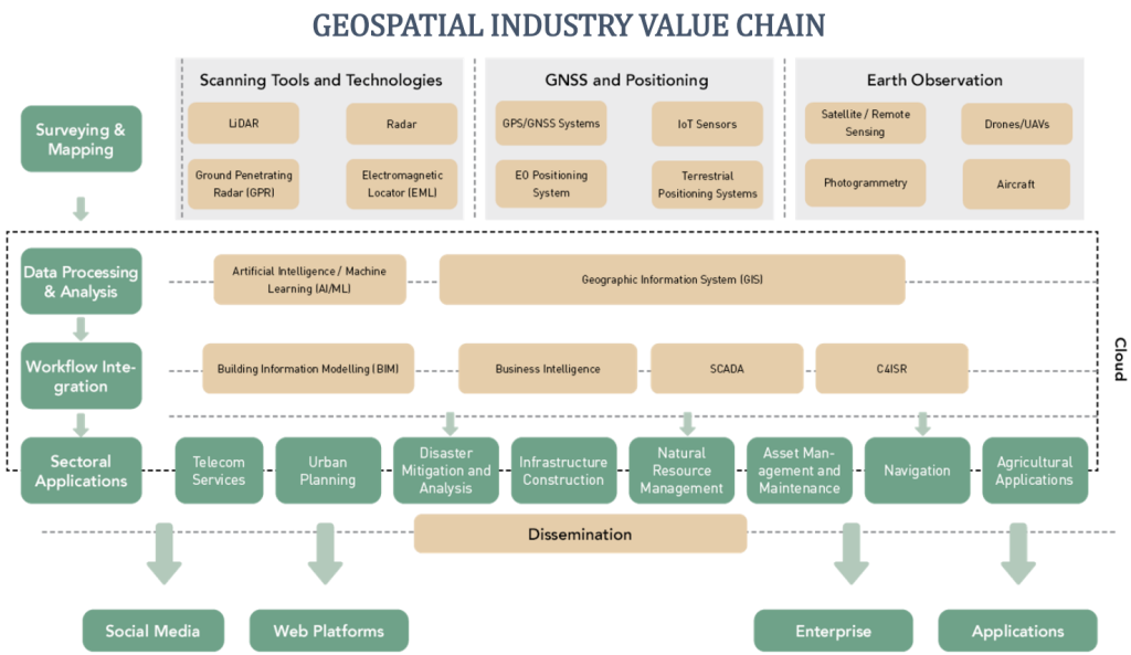 The Geospatial Industry Value Chain represents the various processes and technologies involved in capturing, processing, analyzing, and disseminating geospatial data.